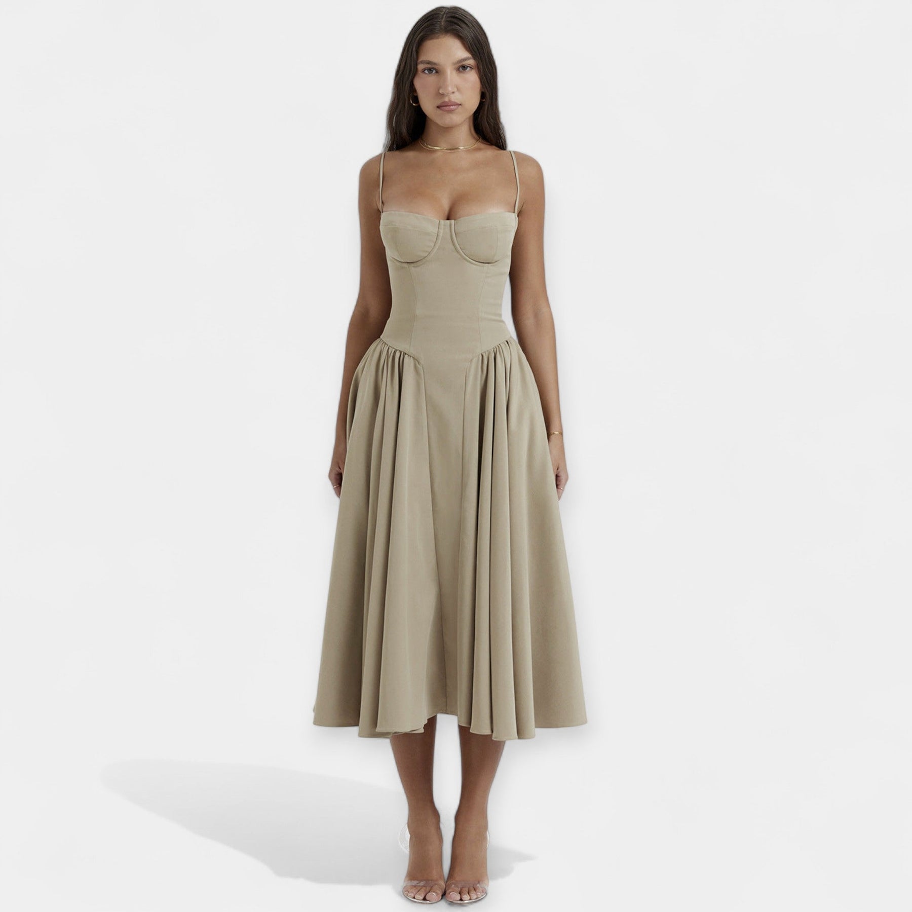 • Κομψό κόψιμο που τονίζει το μπούστο και τη μέση