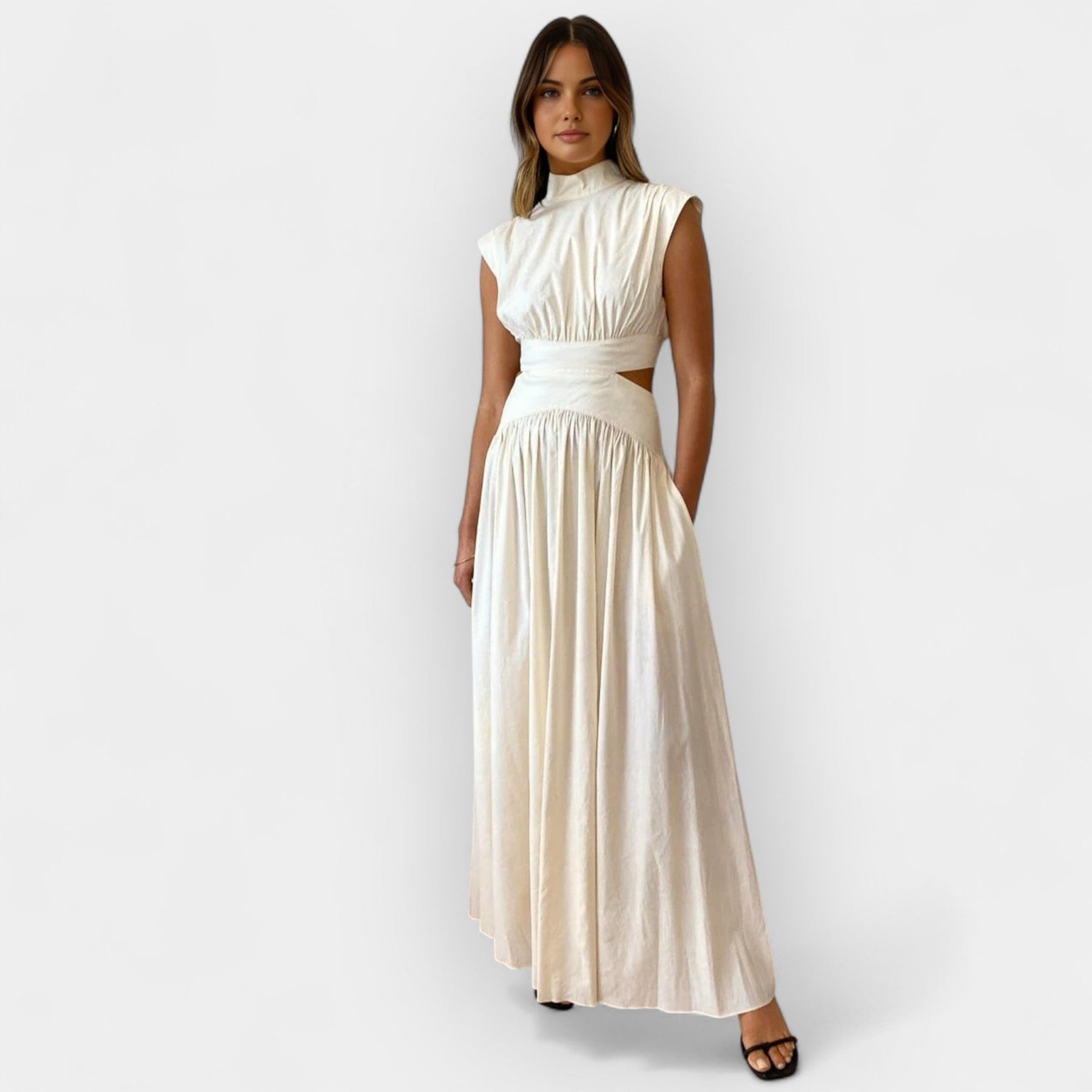 Ανακαλύψτε το εντυπωσιακό φόρεμα που συνδυάζει κλειστή λαιμόκοψη με μοντέρνα ανοίγματα, προσφέροντας μια σύγχρονη και θηλυκή σιλουέτα. Ιδανικό για ιδιαίτερες βραδινές εμφανίσεις με διακριτική τόλμη.