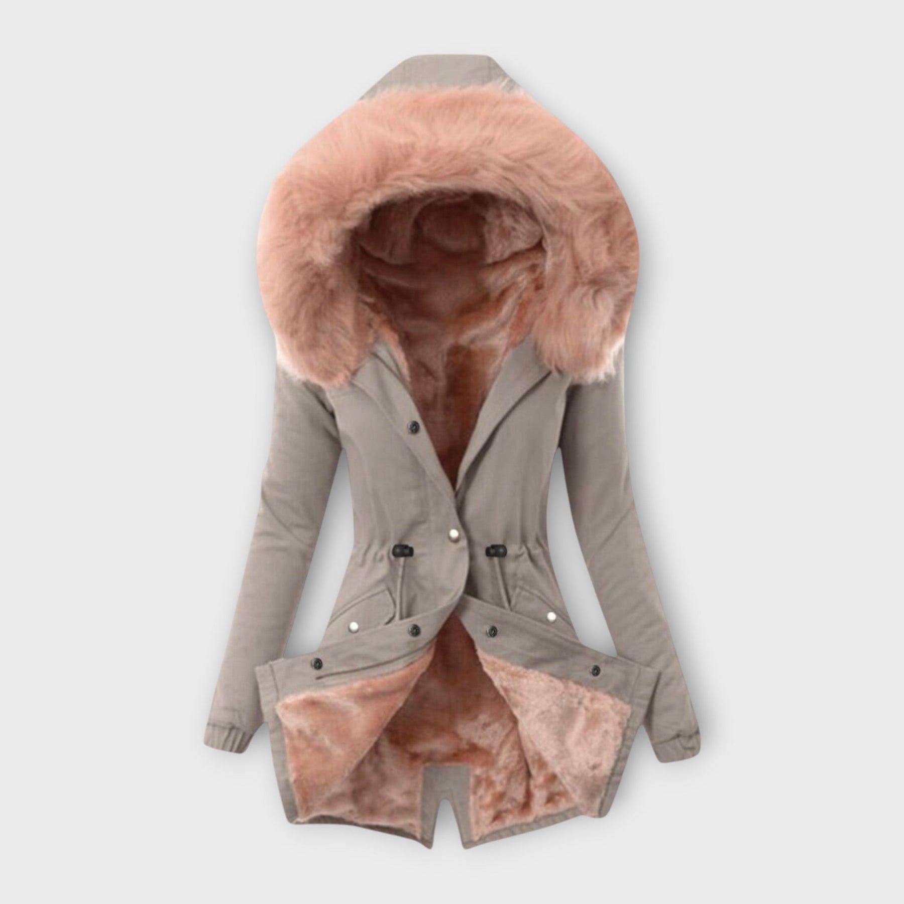Η γενναιόδωρη κουκούλα είναι περιμετρικά επενδεδυμένη με μαλακή τεχνητή γούνα, που όχι μόνο προστατεύει από τον άνεμο και τις καιρικές συνθήκες, αλλά προσθέτει και μια αίσθηση κομψότητας.